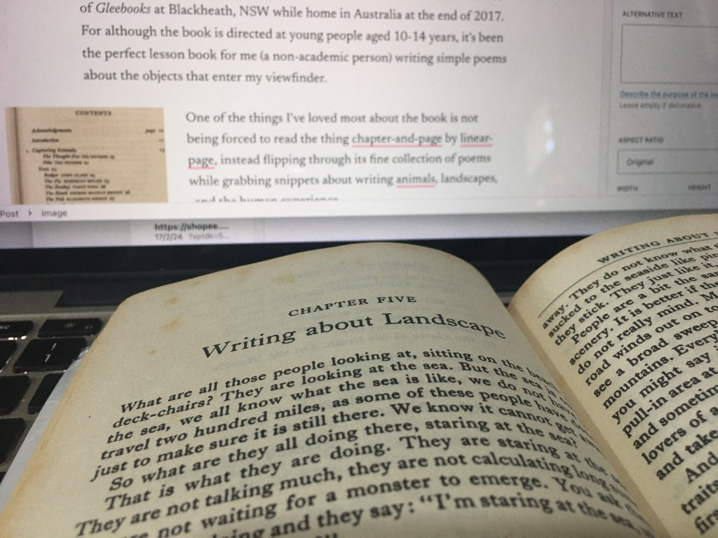 Poetry in the Making is the work of a practising writer sharing the art of writing poetry with children. I was delighted to find this book on the shelves of Gleebooks at Blackheath, NSW while home in Australia at the end of 2017. For although the book is directed at young people aged 10-14 years, it’s been the perfect lesson book for me (a non-academic person) writing simple poems about the objects that enter my viewfinder.
