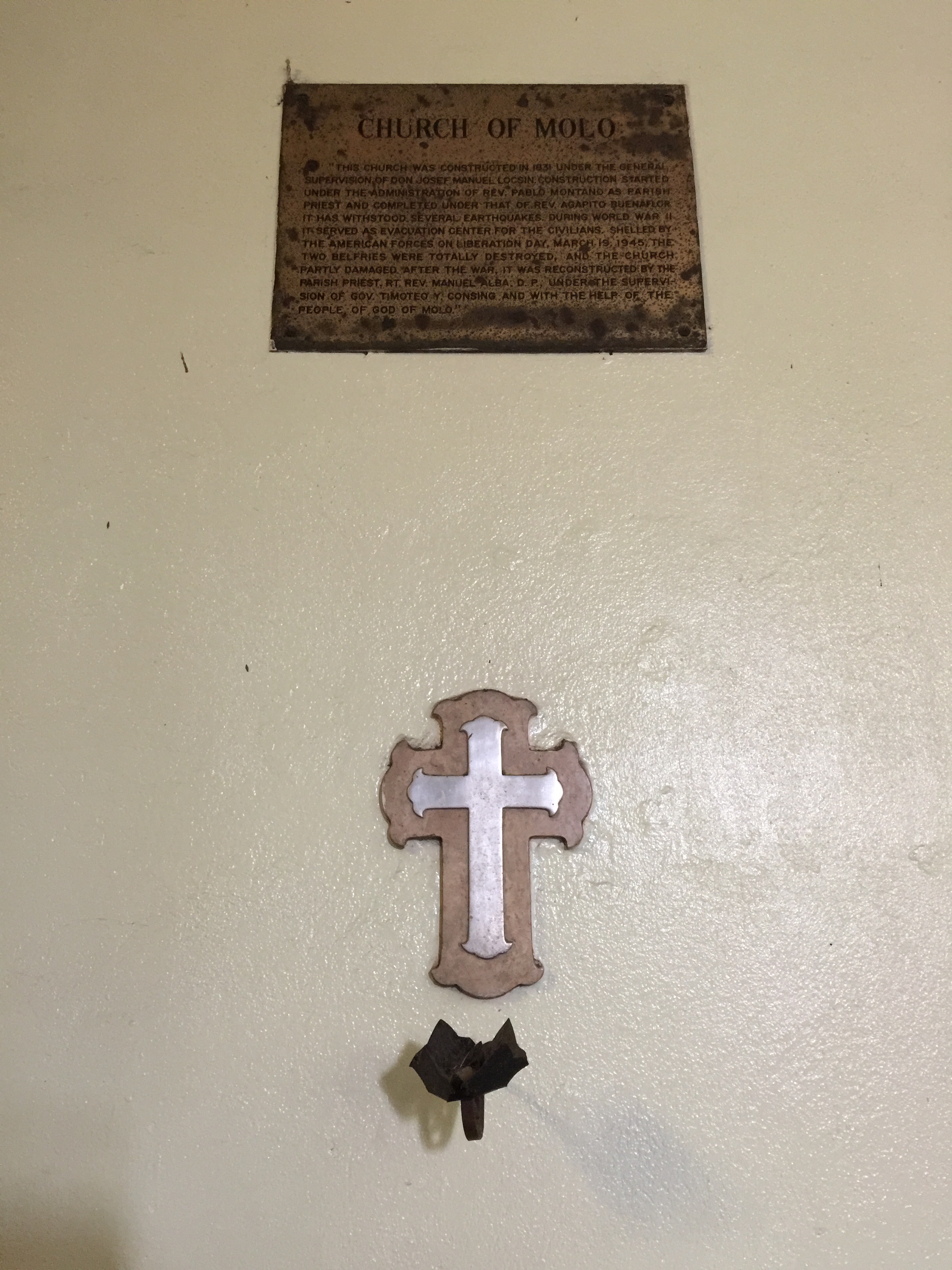 “This church was constructed in 1831 under the general supervision of Don Joseph Manuel Locsin. Construction started under the administration of Reverend Pablo Montano as parish priest and completed under that of Rev. Agapito Buenaflor. It has withstood several earthquakes. During WWII it served as evacuation centre for the civilians shelled by the American forces on Liberation Day March 19, 1945. The two belfries were totally destroyed, and the church was party damaged. After the war, it was reconstructed by the parish priest Rev. Manuel Alba D.P. under the supervision of Gov Timoteo Y. Consing and with the help of the people of God of Molo.”