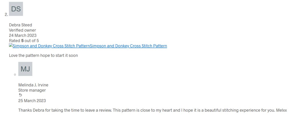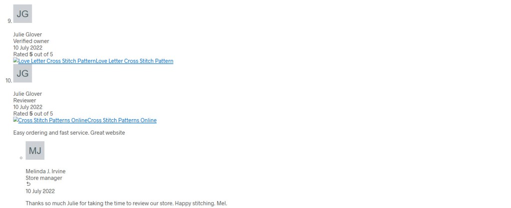 Here are the latest reviews for my digital products. I take customer reviews very seriously and use your feedback to improve my business documents, cross stitch patterns, Ebooks and overall shopping experience. Reviews may only be left by genuine customers who have actually purchased the products.