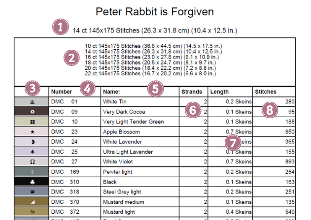– Detailed thread key with fabric dimensions, floss requirements, and project stats. Take it shopping.