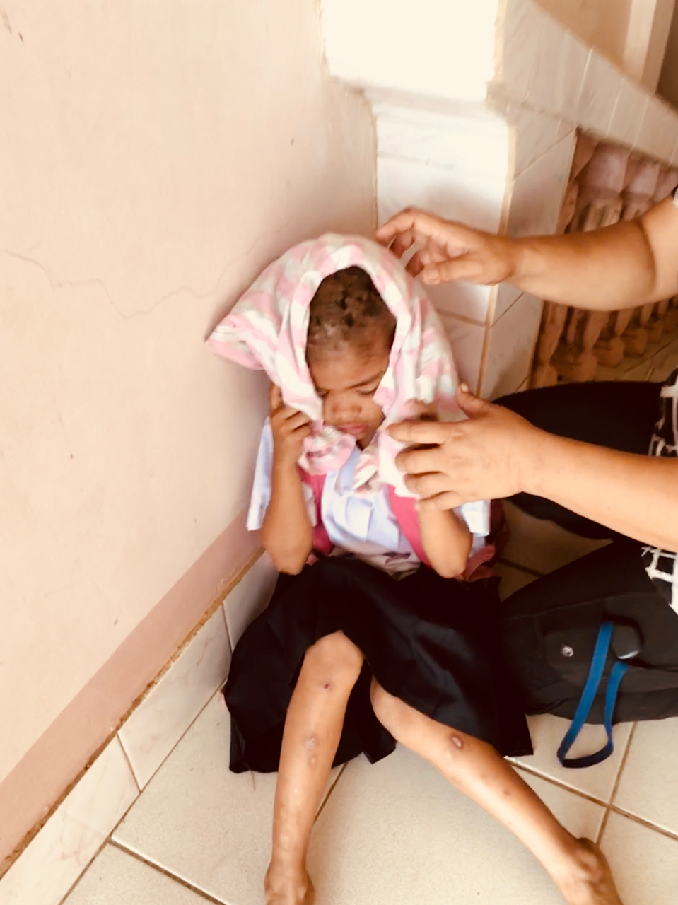 Outside, a little girl of 6 was sitting at the top of the stairs, cringing into the wall. I gasped in horror as my helper and the girl’s elder sister pulled back the fabric covering her face and showed me her head.
