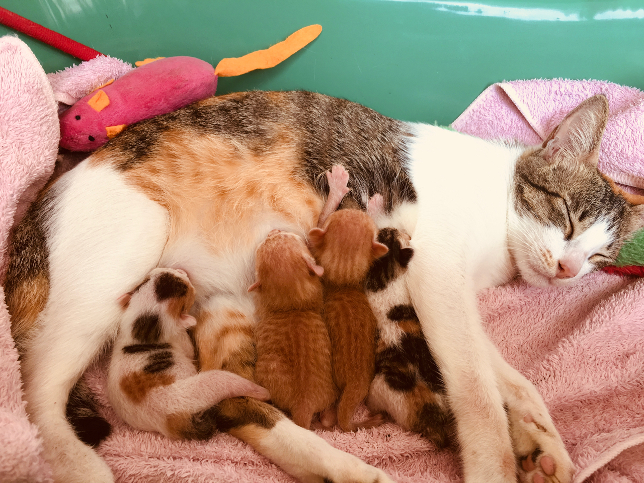 So our four little cuties are called Declan (ginger male 1) David (ginger male 2) Rosalie (little girl mostly white) and Pat (little girl looks most like Maxine). Pat is the weak one and is having trouble feeding and it’s so sweet the way Maxine will gently tend to her. I’ve also been trying as much as possible to help her feed but she’s not terribly interested.