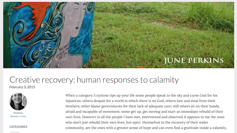 In the aftermath of Cyclone Yasi, Dr June Perkins used her creative projects to support the recovery of the community, developing further skills in community journalism, exhibiting, song writing and film..