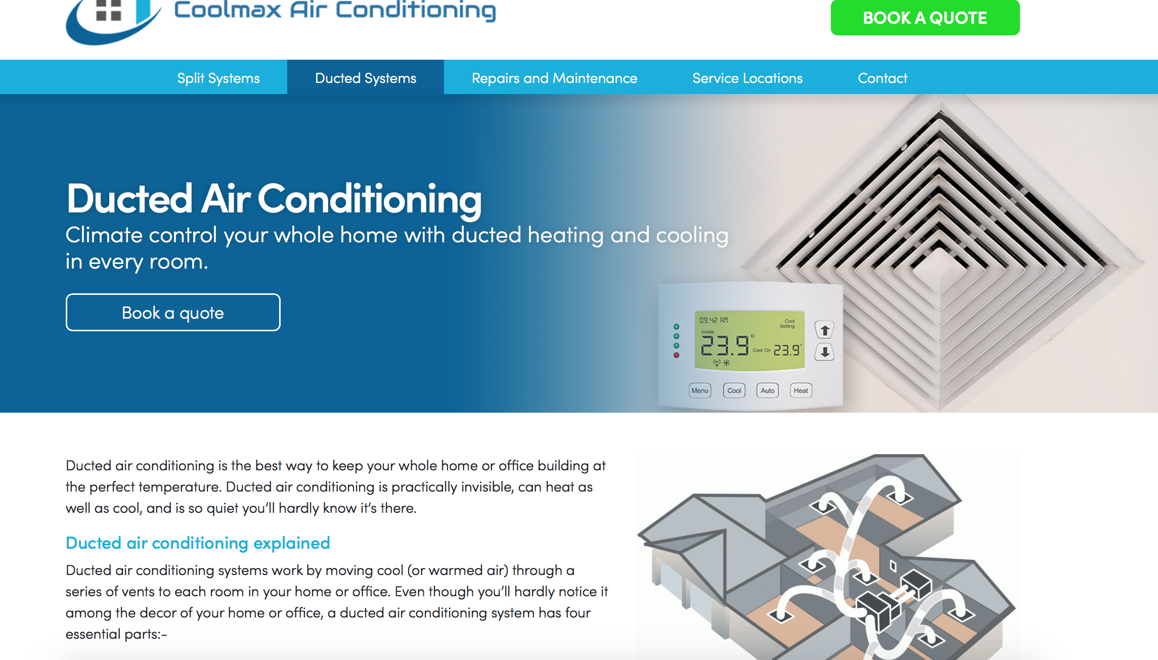Coolmax Air Conditioning serve the greater Sydney area — installing, repairing and maintaining leading brands air conditioning systems. I was hired to write the copy for the Split System, Ducted System, Repairs and Maintenance pages.
