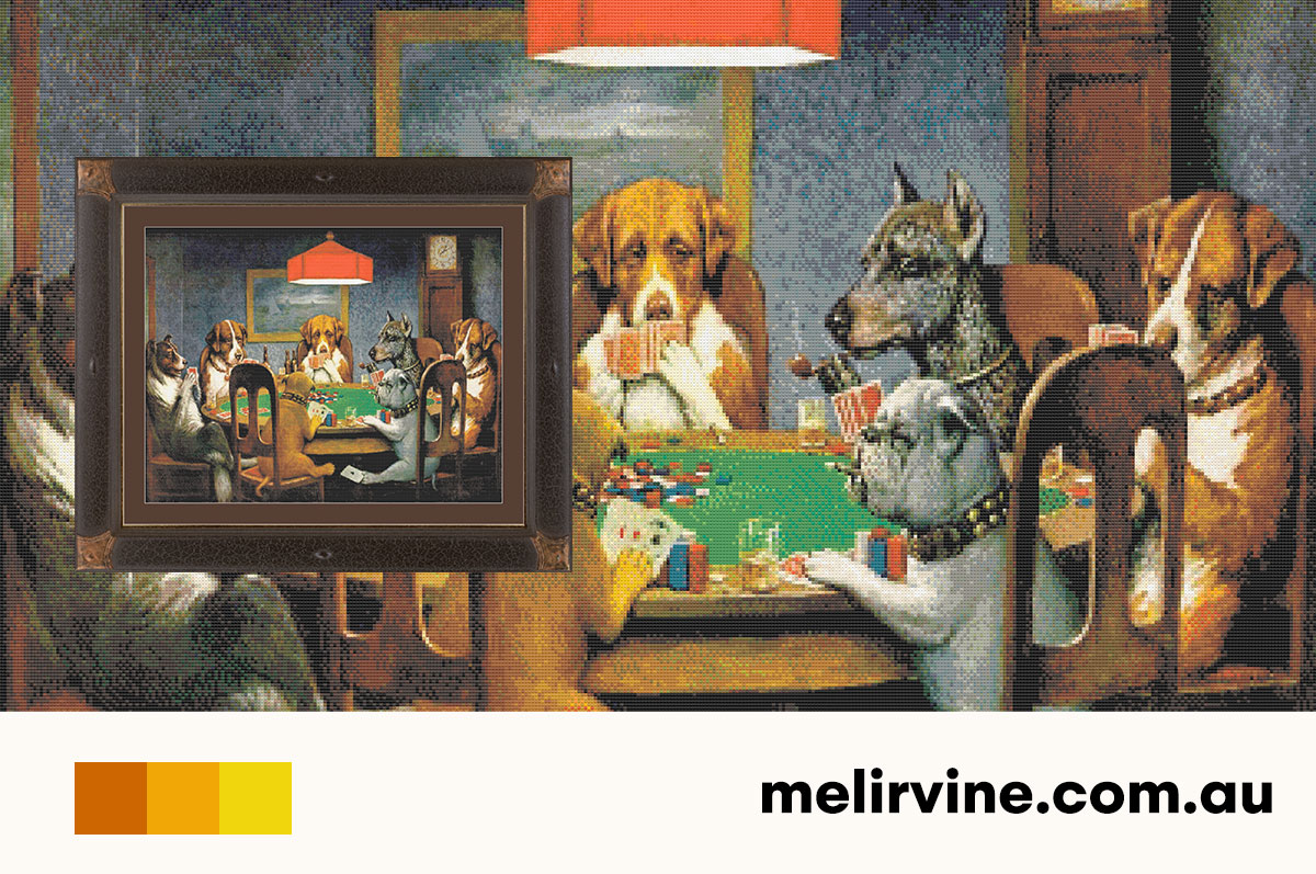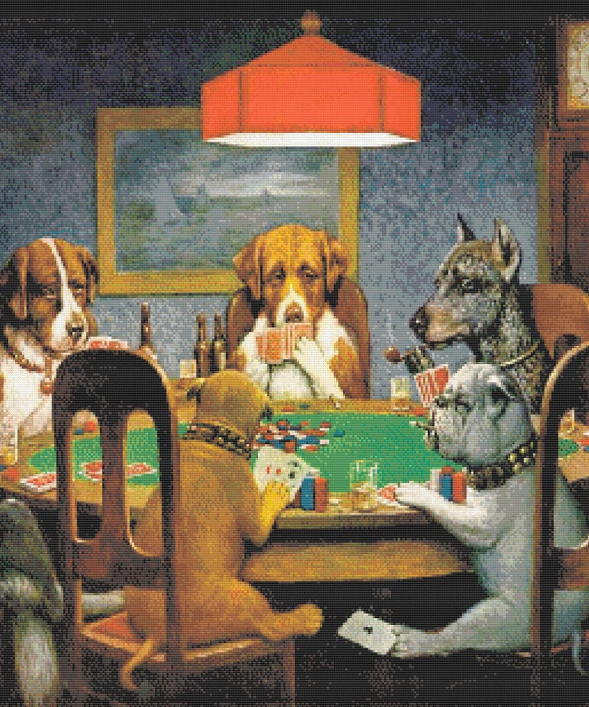 A Friend in Need cross stitch pattern is a replica of the most popular painting from the Dogs Playing Poker series, by Cassius Marcellus Coolidge. In 1903, Coolidge was hired by the advertising agency Brown & Bigelow to produce a series of 16 paintings to be used as promotional calendars, prints, and packaging illustrations.