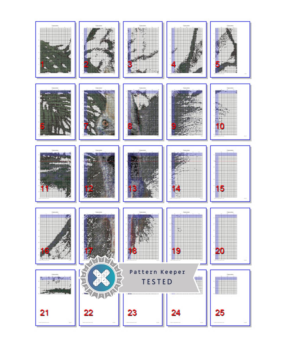 Cassowary cross stitch pattern has been designed specifically for 14 count black Aida cloth. The cassowary’s feathers and lower body merge into the black background and the jungle elements (foliage and fig vines) are represented in dark avocado green and black brown.