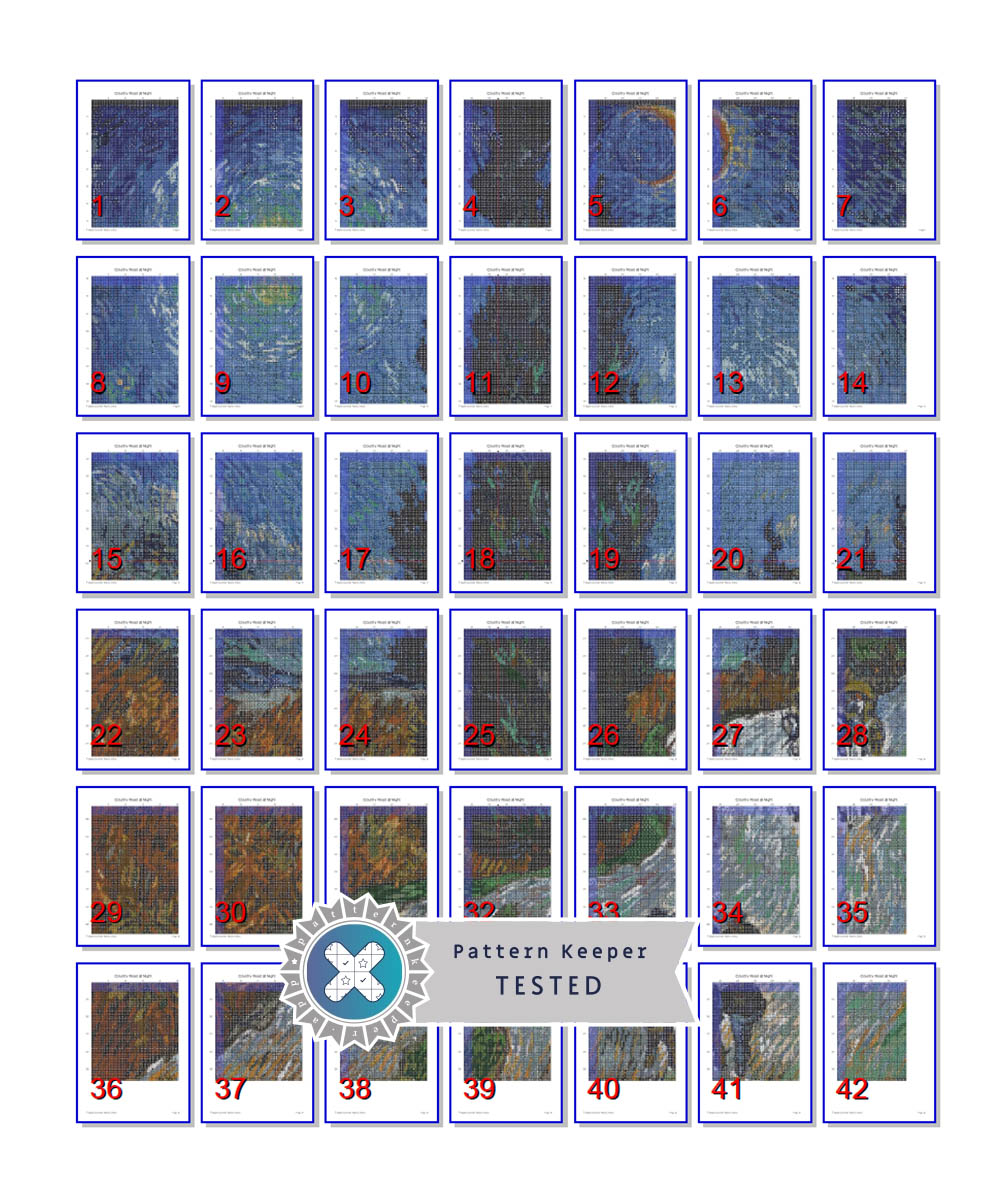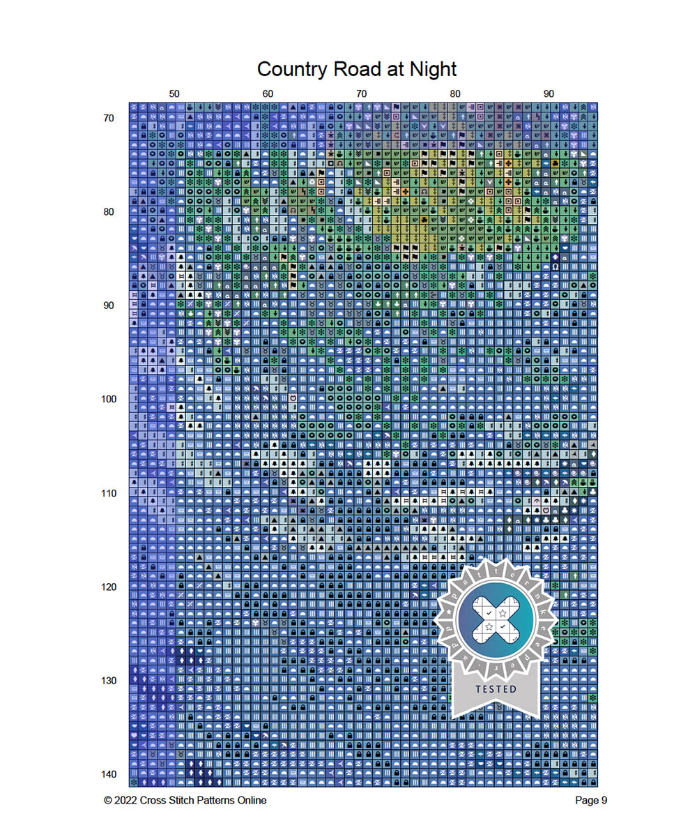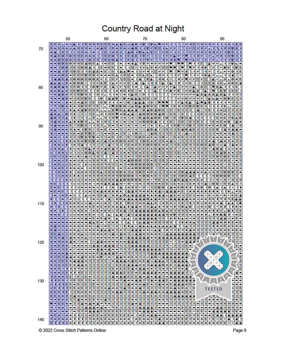 Country Road at Night cross stitch is a large, full coverage cross stitch, requiring 150 different DMC colours and a lot of thread changes. There is some serious confetti in this project. It measures 56.2cm x 71.8cm when stitched on 14 count Aida cloth (122,760 stitches). If you are up for the challenge, I recommend using Pattern Keeper to manage your project and you’ll find an additional PK chart in your download pack.