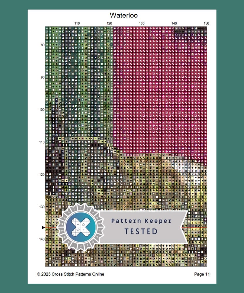- Waterloo — 400 x 272 grid (72.6 x 49.3cm) 150 DMC colours — the sequel to “A Bold Bluff” as Judge Saint Bernard causes an uproar when his dodgy (but winning) hand is exposed.