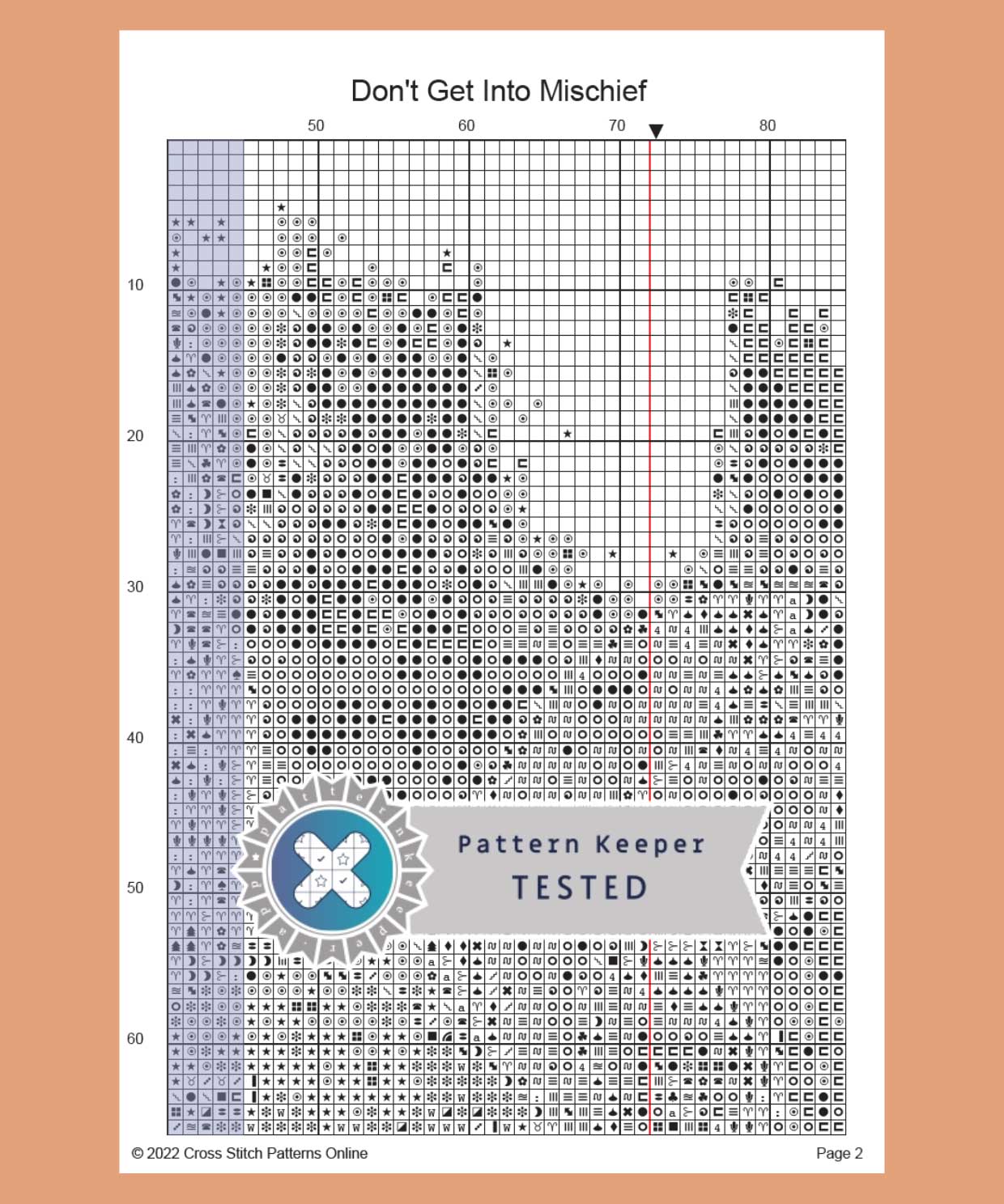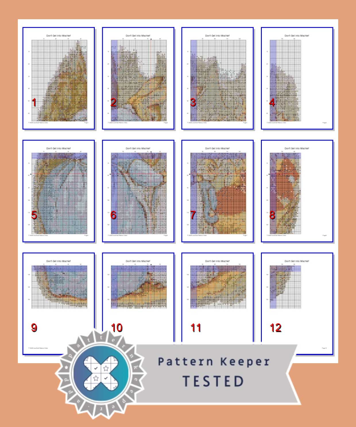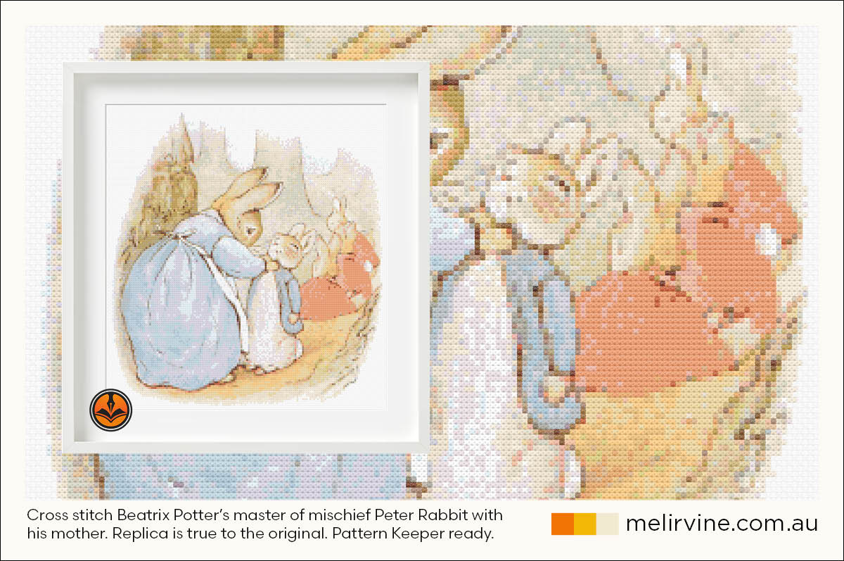 This is a (mostly) full coverage cross stitch but I’ve cut away the edges, just like the original painting in the book. You’ll be stitching Peter Rabbit being put into his blue coat, along with his mother and sisters. The finished piece measures 26.3cm x 28.5cm when stitched on 14 count Aida cloth, but you’ll only be completing around 18,314 stitches. The pattern works perfectly with Pattern Keeper App and there NO backstitches.