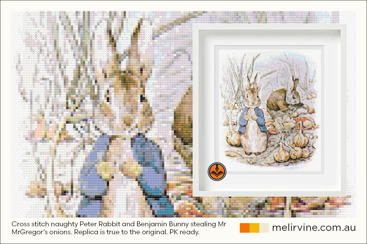 Gathering Onions cross stitch pattern is a replica of Beatrix Potter’s drawing of Peter Rabbit and his cousin Benjamin Bunny helping themselves to the vegetables in Mr McGregor’s garden.