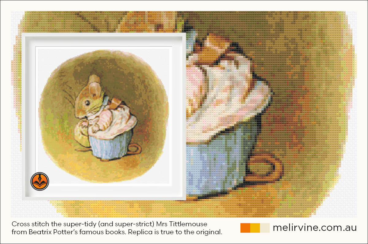 Mrs Tittlemouse cross stitch pattern was inspired by the front cover of Beatrix Potter’s famous book about a clean, tidy and no-nonsense sort of mouse. When Mrs Tittlemouse finds the wet and muddy (and totally uninvited) Mr Jackson in her parlour she is extraordinarily polite — but still follows him about cleaning up his muddy footprints.