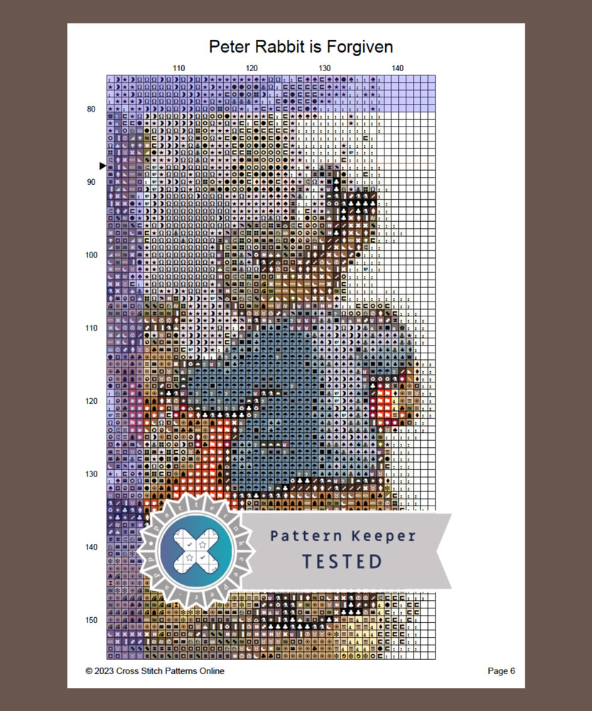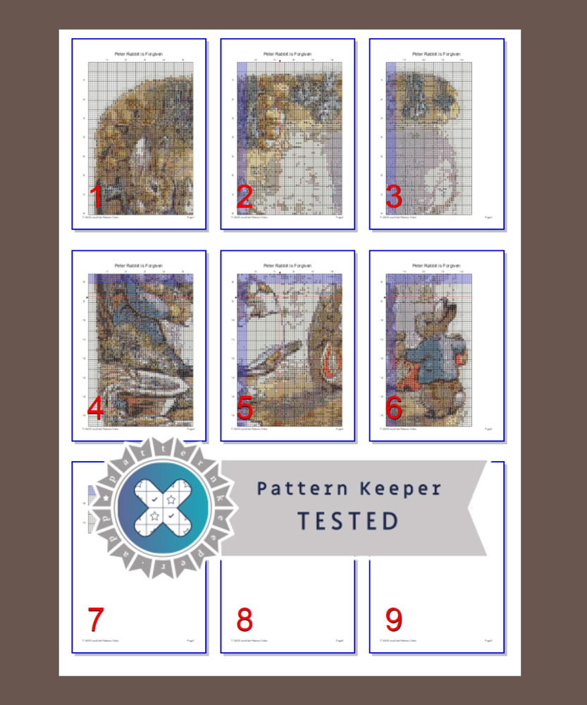 This beautiful cross stitch is a very manageable size. The finished piece measures 26.3cm x 31.8cm when stitched on 14-count Aida cloth, but you’ll only be completing 22,503 stitches. You’ll need 67 different DMC colours to recreate the little rabbit brothers folding the red hankie. The pattern works perfectly with Pattern Keeper App and there are NO backstitches.