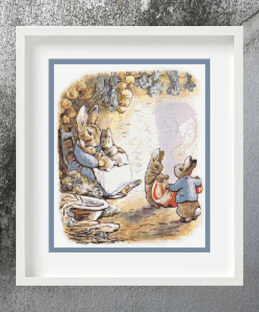 Peter Rabbit is Forgiven cross stitch is the last pattern in the four-set series that illustrates the story of Benjamin Bunny by Beatrix Potter. You’ll get to stitch Peter Rabbit and his cousin Little Benjamin Bunny as well as Flopsy, Mopsy, Cotton-tail, Mr Benjamin Bunny Snr, Mrs Rabbit –and the vegetables from Mr McGregor’s garden (which play a leading role in the drama).