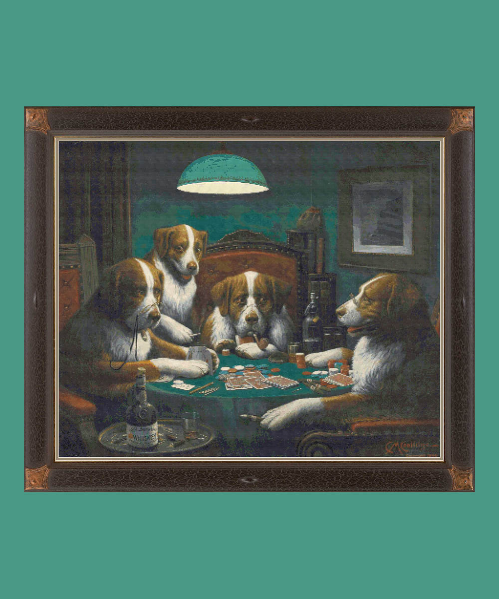 It’s not commonly known, but Dogs Playing Poker by Cassius Marcellus Coolidge refers to not just one painting, but 18 of them! The series includes the artist’s original ‘Poker Game’ (1894) painting, along with 16 other oil paintings commissioned in 1903 by Brown & Bigelow to advertise cigars, and an additional 1910 painting. All eighteen of these paintings feature comical, humanized dogs; however, only eleven of the paintings actually depict poker-faced pups playing cards around a table.