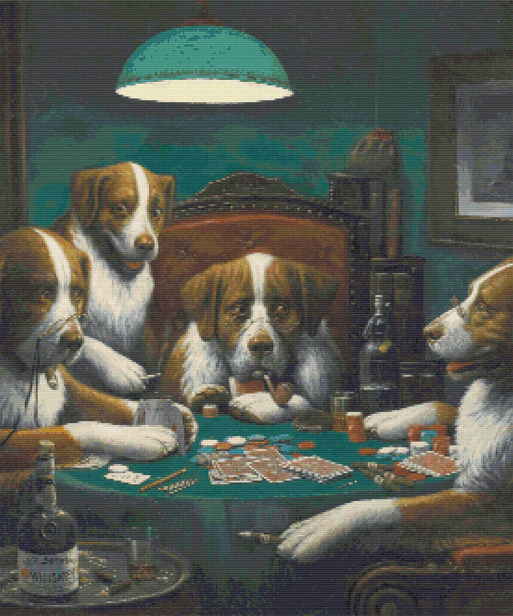 Poker Game cross stitch pattern is a replica of the famous kitsch painting by Cassius Marcellus Coolidge. Like many great artists, Coolidge’s paintings were ridiculed by contemporaries in the early 1900s, but over the years his dogs playing poker have become pop culture icons. In fact the original Poker Game fetched a slick USD$658,000 at a 2015 auction.