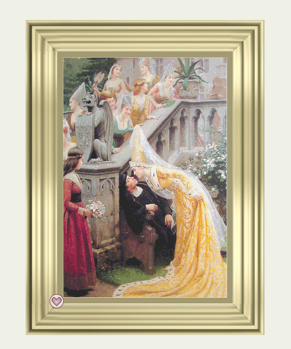 Queen’s Kiss cross stitch pattern was inspired by the 1903 painting ‘Alain Chartier‘ by British artist Edmund Blair Leighton. In a tribute to medieval times, the fashionably dressed Royal Margaret of Scotland, happens upon the French poet Alain Chartier asleep in the garden. In a surprising act of tenderness, she kisses the young bard gently on the lips and whispers some words of gratitude before she returns to her entourage of young women. What a great story!