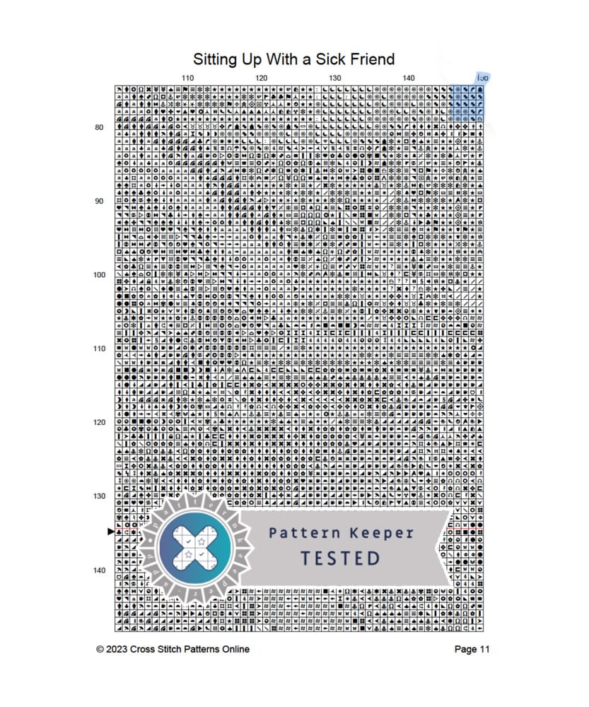 Sitting Up With a Sick Friend cross stitch is a large, full-coverage project and the finished piece measures 72.6 x 56.1cm when stitched on 14-count Aida cloth (400 x 269 grid size). You’ll need 148 different DMC colours and the project contains 107,600 cross stitches.