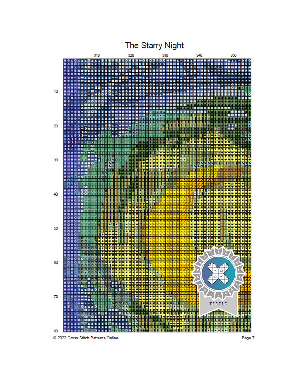 This is a flattened version of Van Gogh’s Starry Night — so you can stitch the incredible colours without having to navigate confetti. The finished piece measures 68cm x 54.4cm (375 x 300 grid) when completed on 14-count Aida cloth with 112,500 stitches. Your download pack also includes an extra chart that has been specially formatted for the Pattern Keeper App.