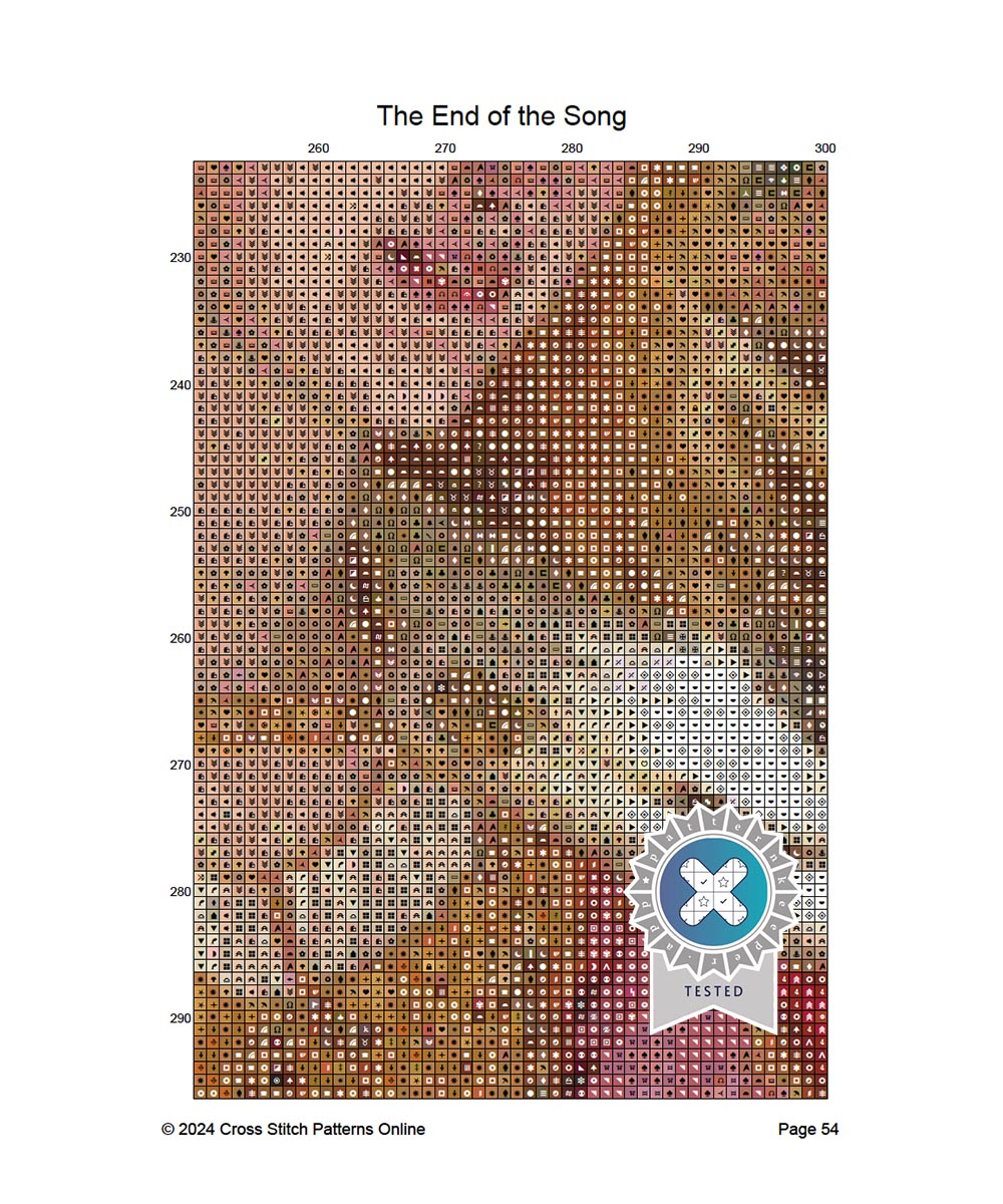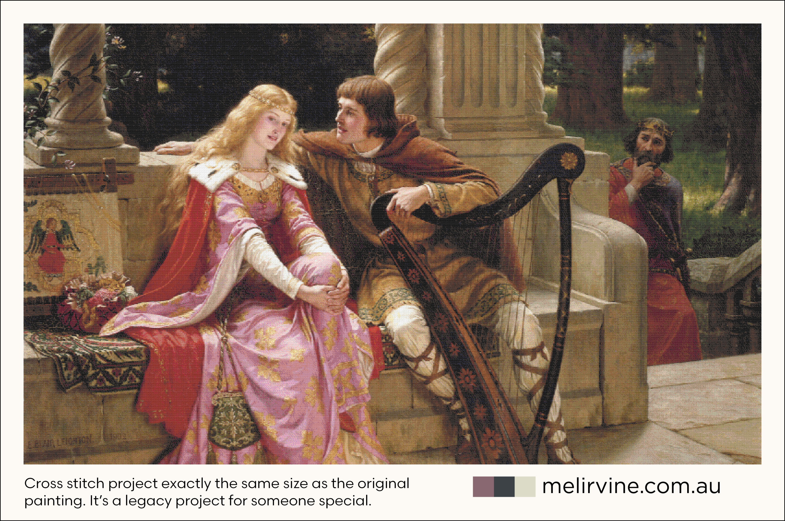 The End of Song cross stitch pattern was inspired by the gorgeous 1902 painting (of the same name) by British artist Edmund Blair Leighton. This romantic scene features the passionate lovers Tristan and Isolde in a tender moment — with King Mark (Isolde’s intended husband and Tristan’s uncle) happening upon the young couple.