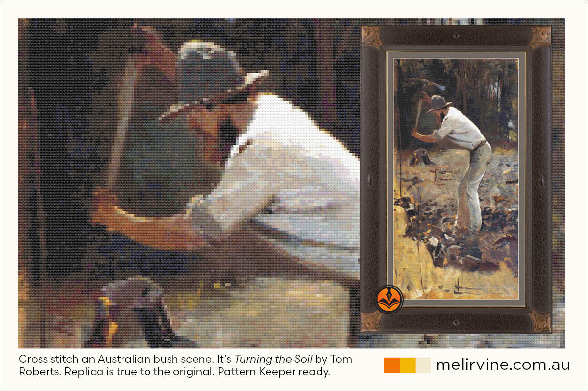 Turning the Soil cross stitch pattern was inspired by the rural paintings of Australian impressionist artist Tom Roberts. This is one of his lesser known paintings but I immediately fell in love with the rich yellows, golds and earthtones and I just had to chart it into a cross stitch. I hope you love it as much as I do.