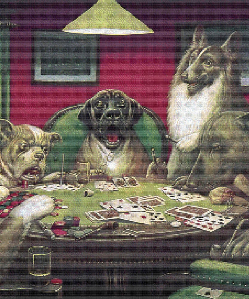 Waterloo cross stitch pattern is the sequel painting to A Bold Bluff from the Dogs Playing Poker paintings, by Cassius Marcellus Coolidge.