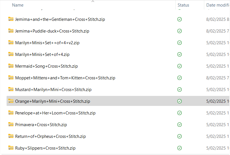 When you purchase one of my digital cross stitch patterns, you’ll download a .zip file containing your PDF pattern. Zipped (compressed) files take up less storage space and can be transferred to other computers much faster than uncompressed files.